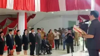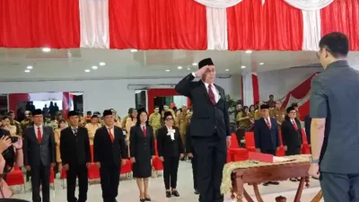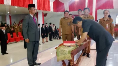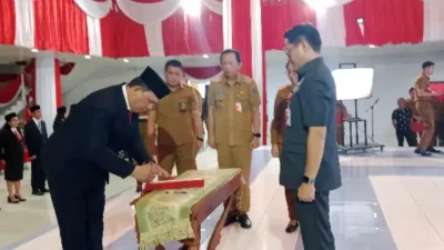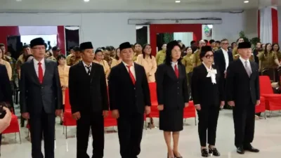 Minut — Bupati Minahasa Utara (Minut), Joune Ganda, resmi melantik dan mengambil sumpah belasan Pejabat Pimpinan Tinggi Pratama di Atrium Kantor Bupati Minut, Selasa (7/10/2025).