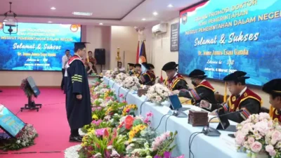 Jakarta — Bupati Minahasa Utara, Dr. Joune James Esau Ganda, secara resmi berhasil menyandang gelar doktor setelah sukses mempertahankan disertasinya dalam Sidang Promosi Doktor yang digelar di Institut Pemerintahan Dalam Negeri (IPDN), Rabu (4/3/2026).