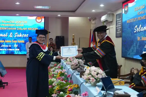 Jakarta — Bupati Minahasa Utara, Dr. Joune James Esau Ganda, secara resmi berhasil menyandang gelar doktor setelah sukses mempertahankan disertasinya dalam Sidang Promosi Doktor yang digelar di Institut Pemerintahan Dalam Negeri (IPDN), Rabu (4/3/2026).